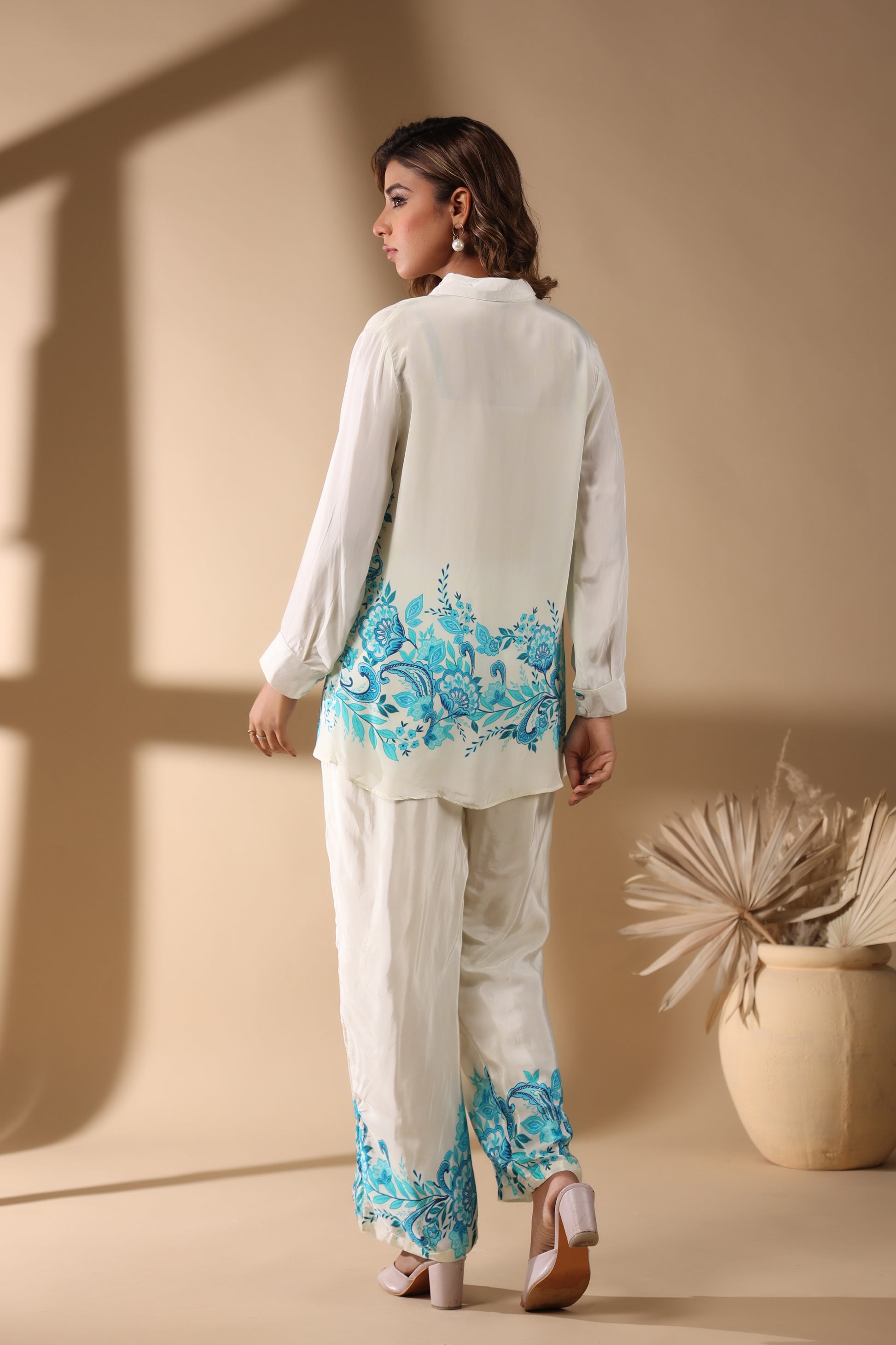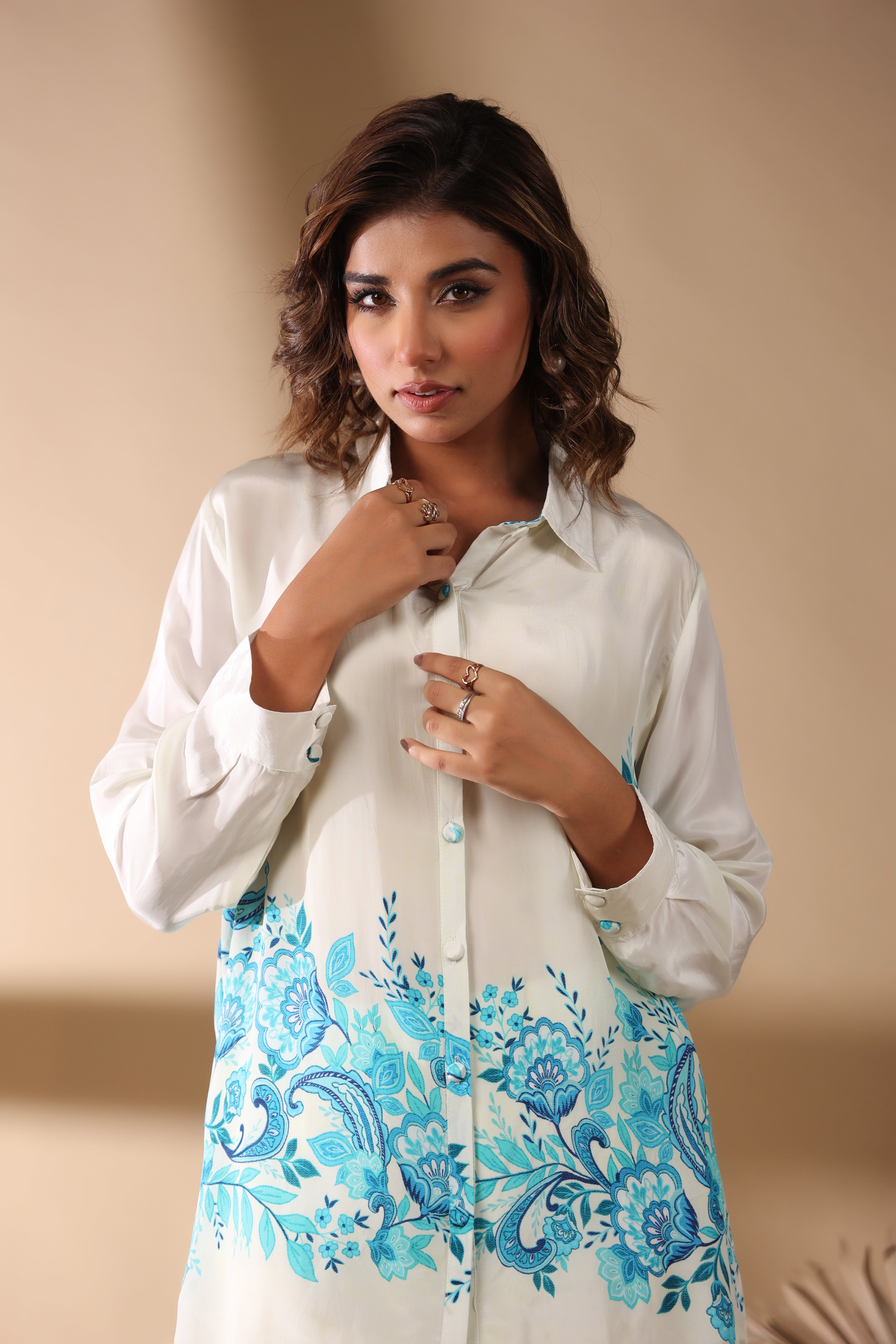 Floral Shiny natural crepe coord set with beautiful blue floral print.