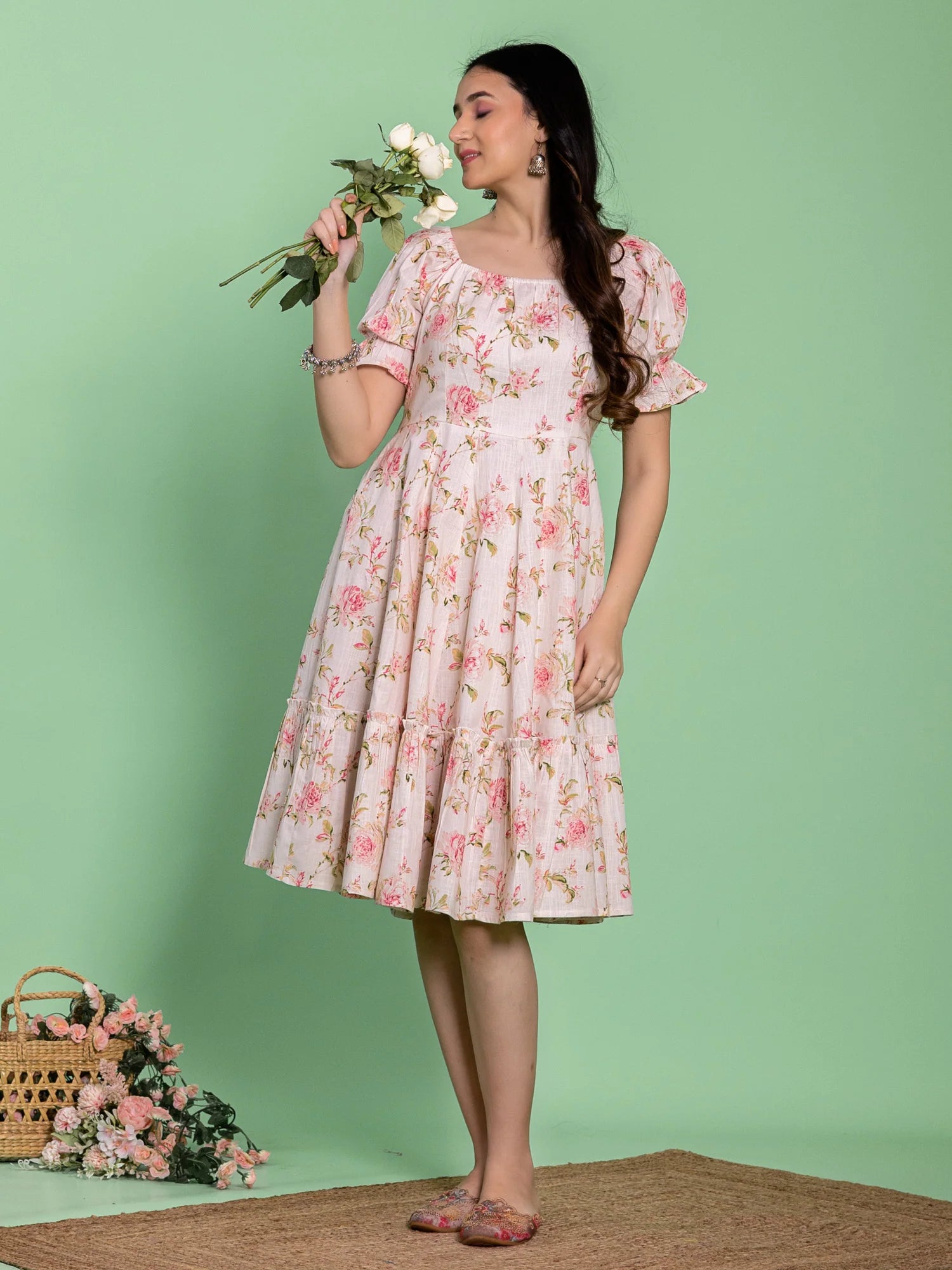 Flared Cotton Slub Floral Pink Dress , for women who love comfort with style in Dubai. Crafted from soft, breathable cotton, this dress with puffed sleeves mul cotton lining a beautiful floral print and a graceful flared silhouette that enhances movement and charm. Lightweight and airy, it is perfect for brunches, casual outings, vacations, and daytime events and all day .