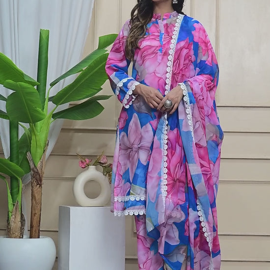 Step into effortless elegance with this stunning multicolour floral suit, crafted for the modern woman who loves style and sophistication. Made from premium cotton, this outfit ensures all-day comfort while exuding charm. The lace detailing on the kurta and trousers adds a touch of grace, making it perfect for both casual outings and festive gatherings.