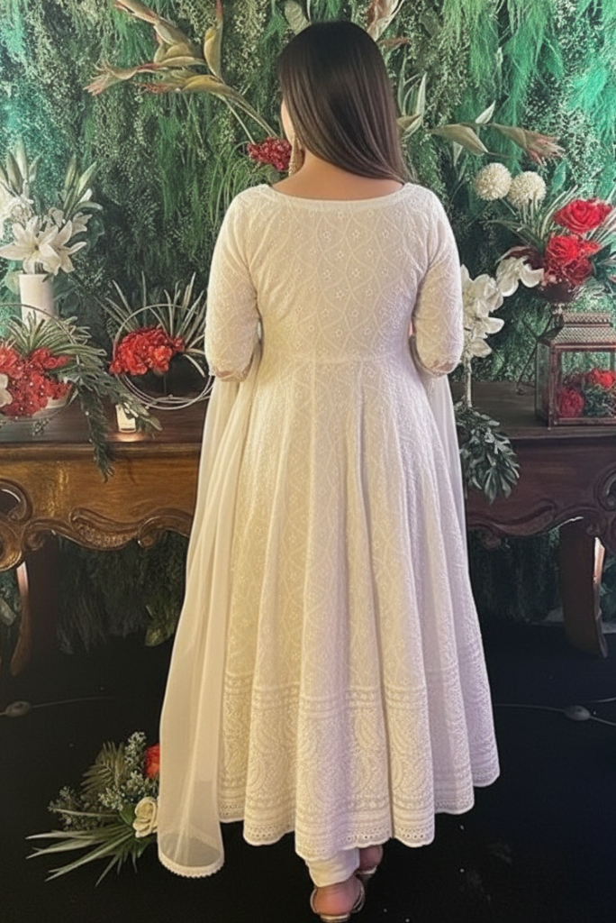 ivory white embroidered anarkali kurta set curated for women in Dubai. Crafted with intricate all-over embroidery and a graceful flared silhouette, with chikankari 3 piece set includes a matching bottom and a soft, flowy dupatta. Made from lightweight, breathable fabric, it is perfect for festive occasions, weddings, celebrations, and elegant day events and parties wear.